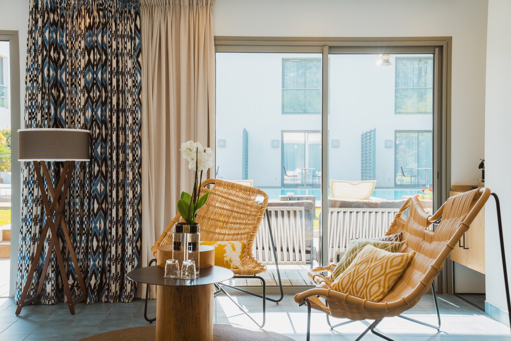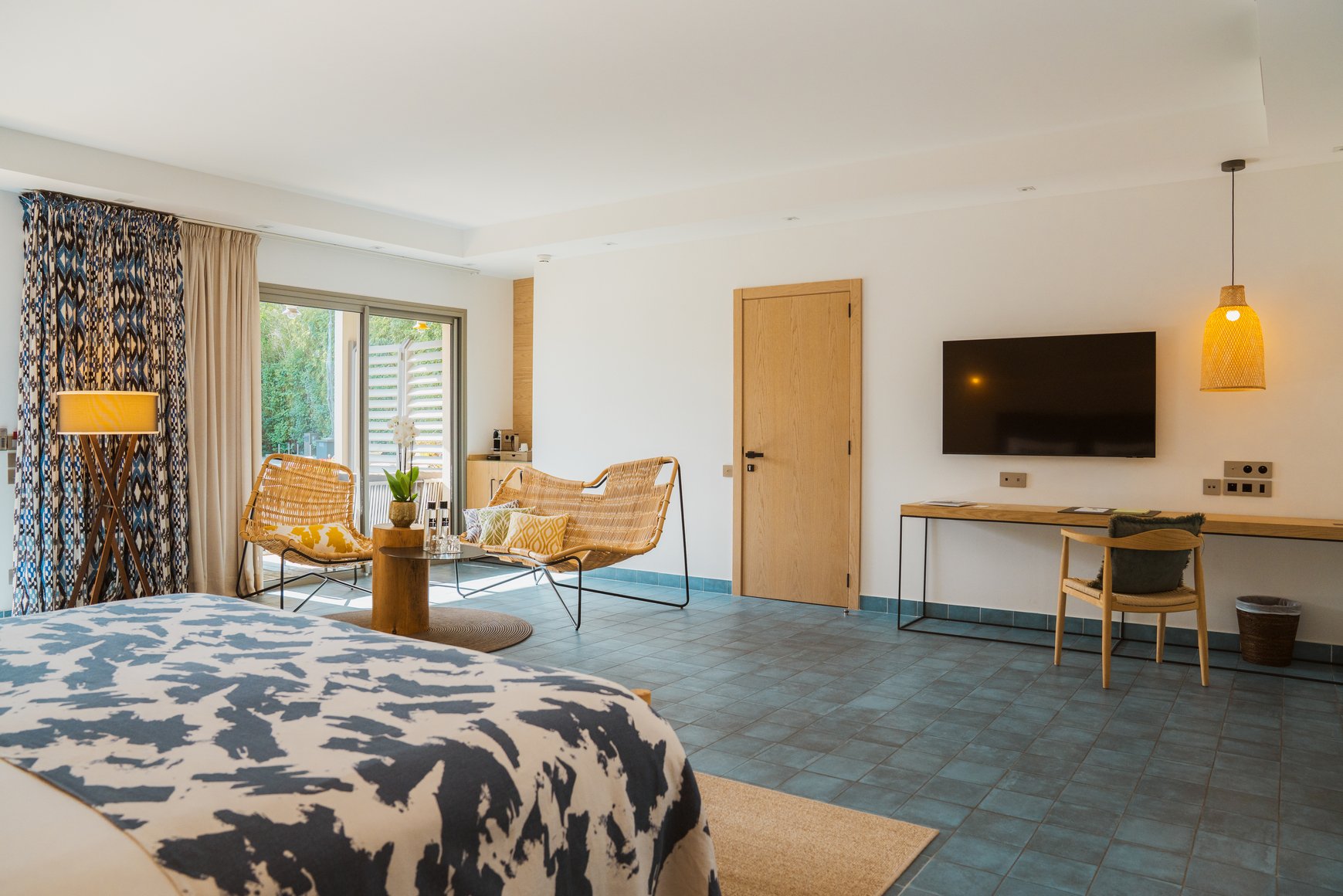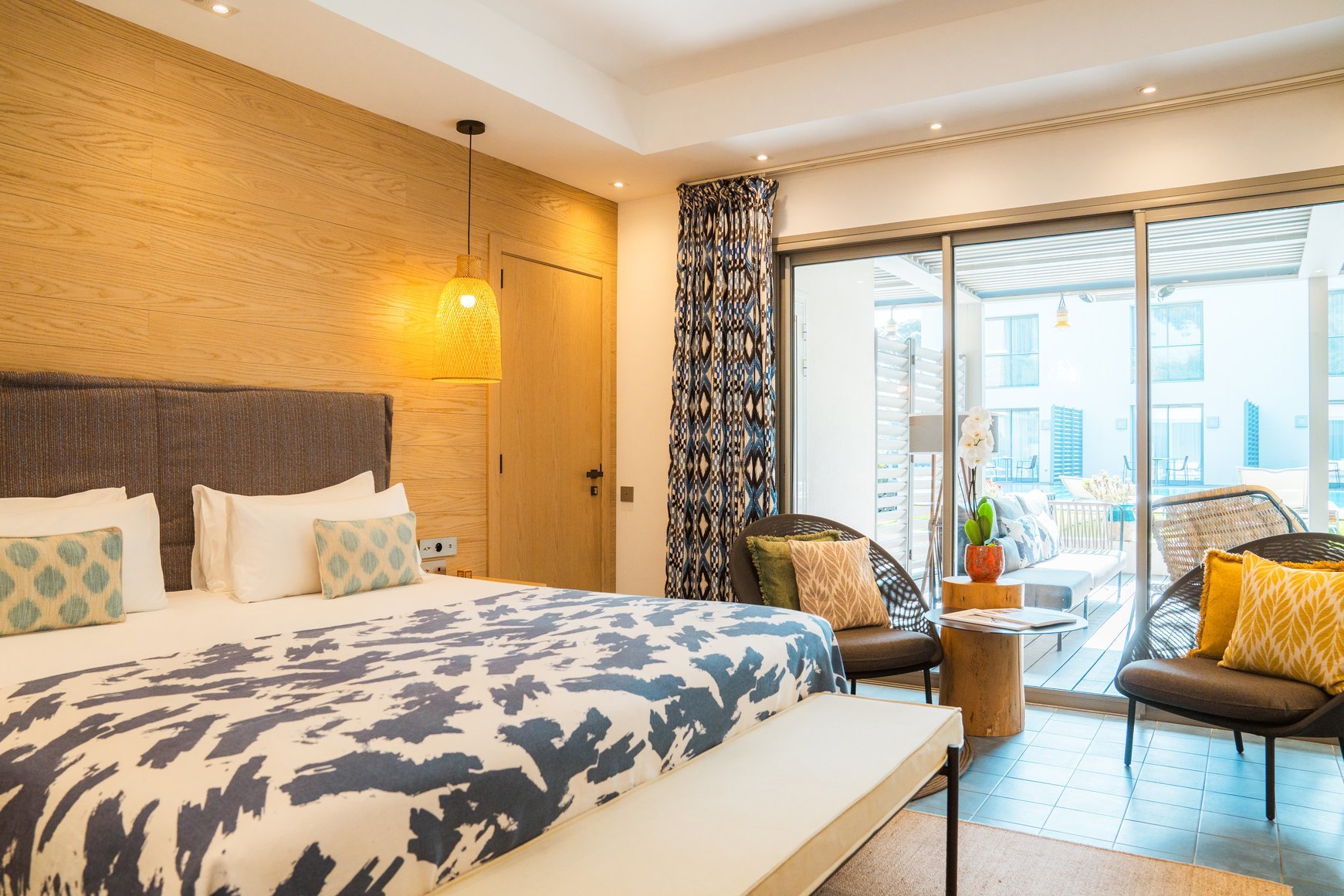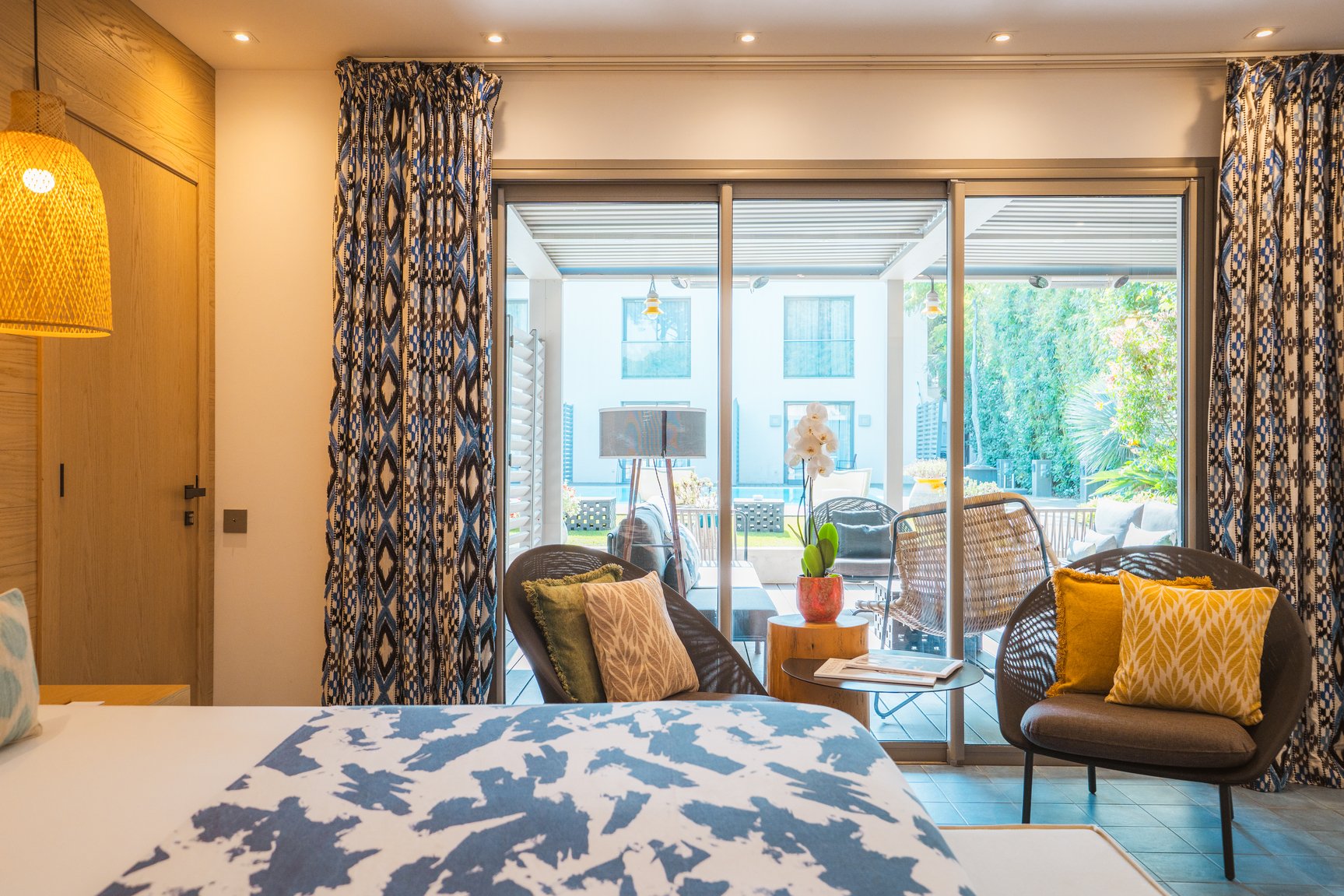 La Junior Ibiza de l’hôtel Kube Saint-Tropez s’étend sur 60m2 s’ouvrant vers une terrasse couverte bioclimatique de 20m2 dont la décoration invite au cocooning.
